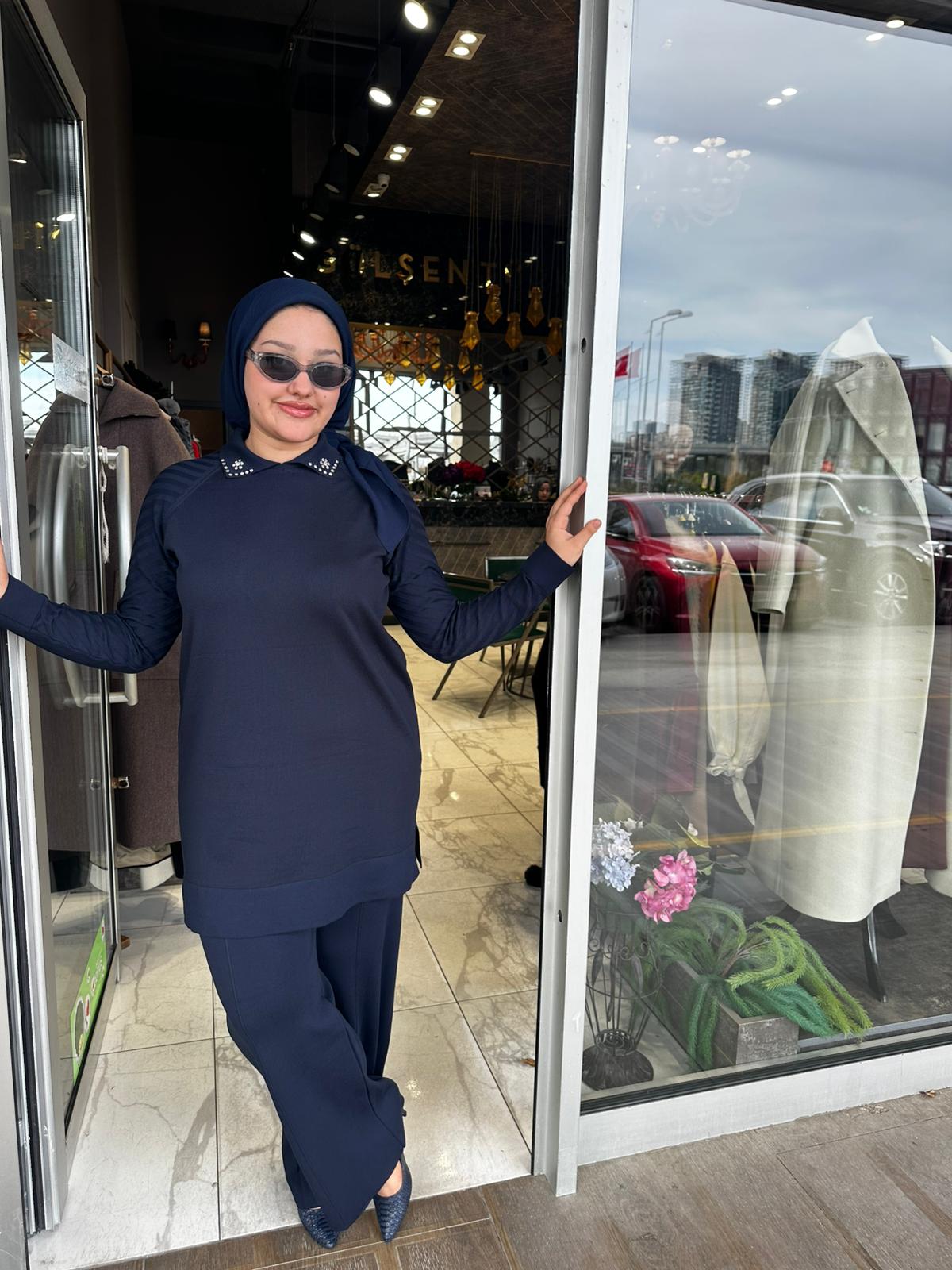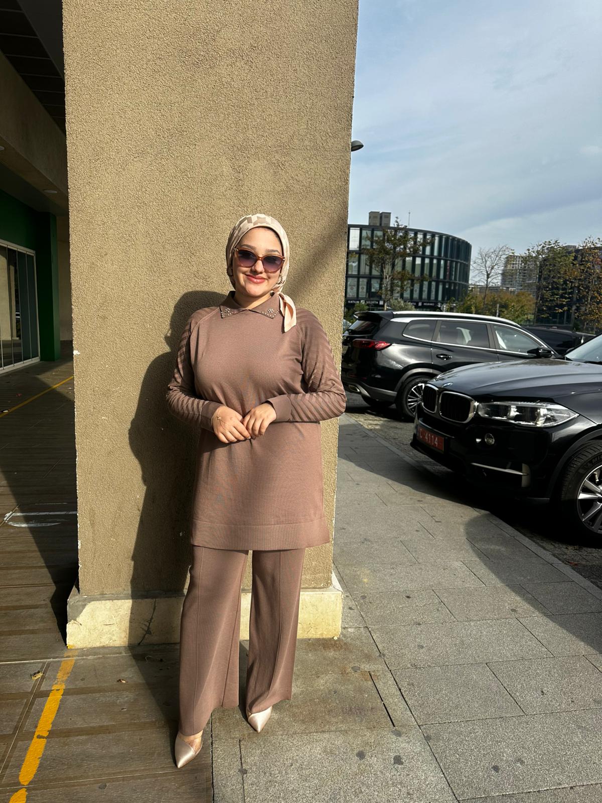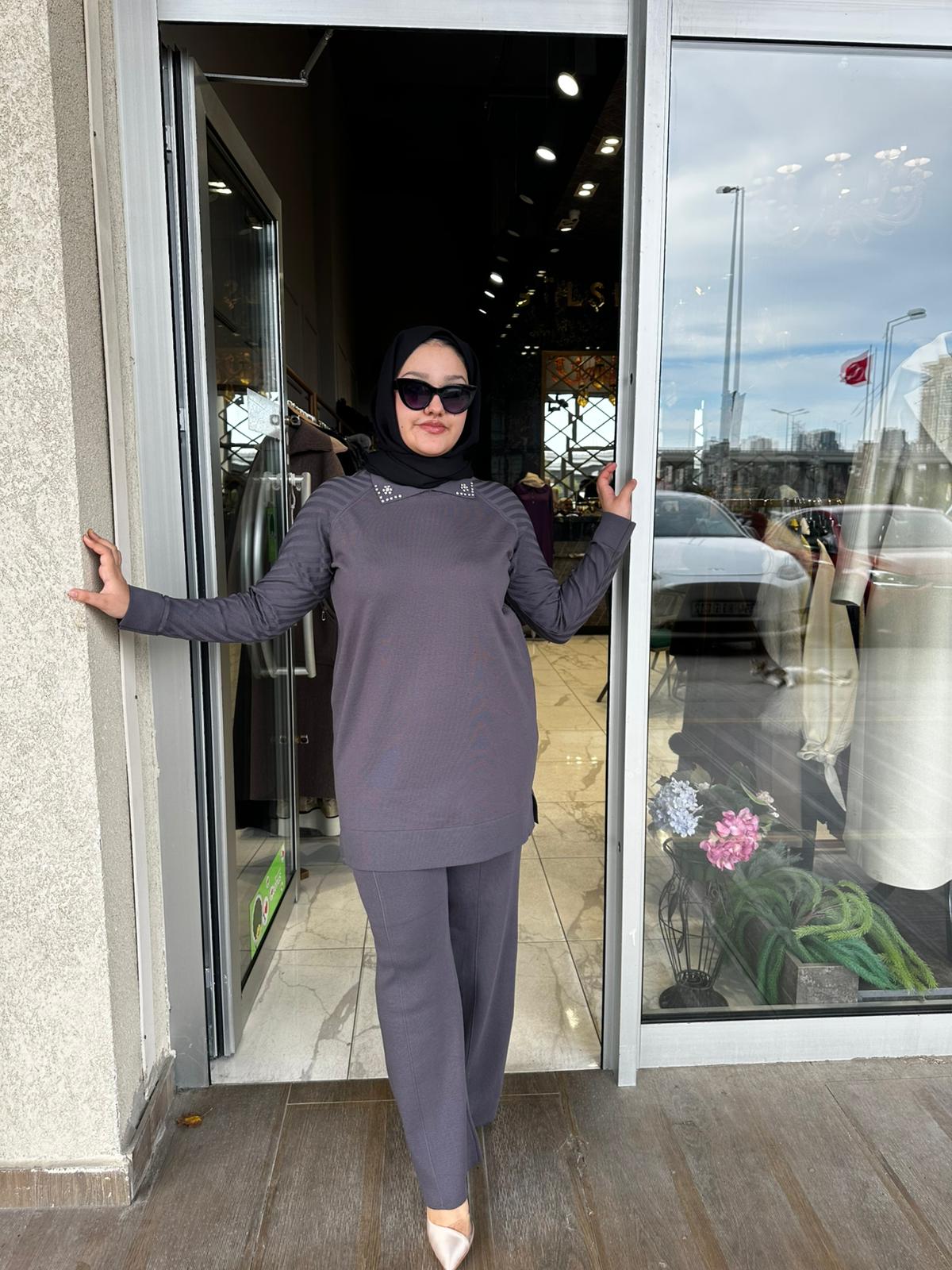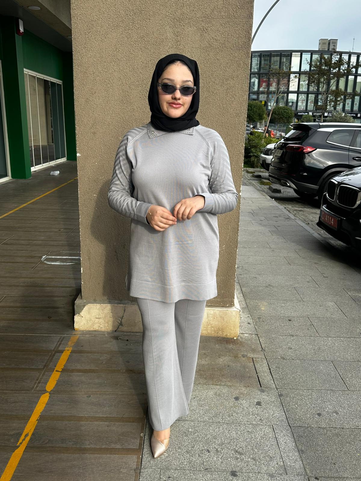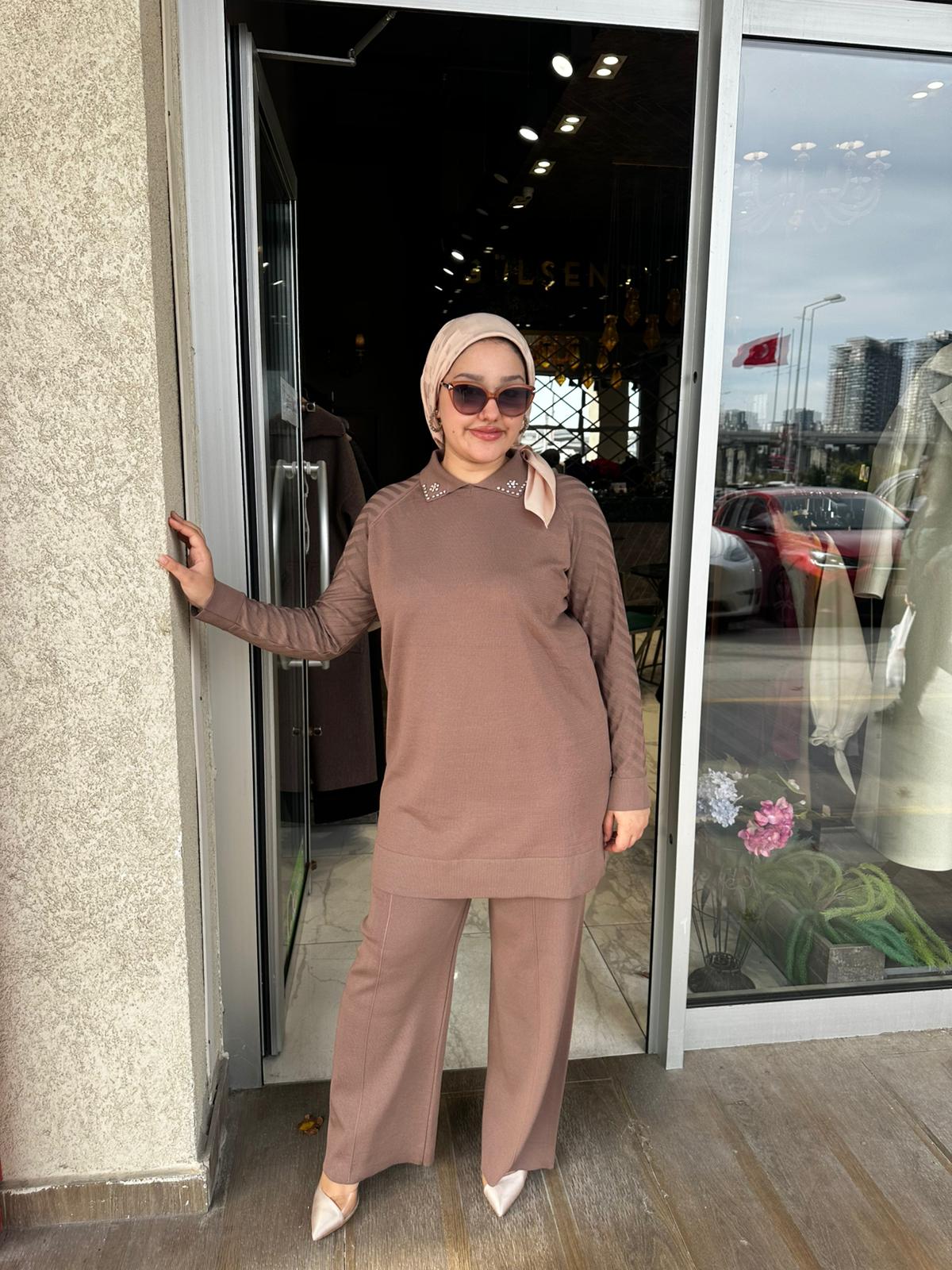 Yaka Taş Kol Çizgi Detaylı Merserize Pantolon Takım