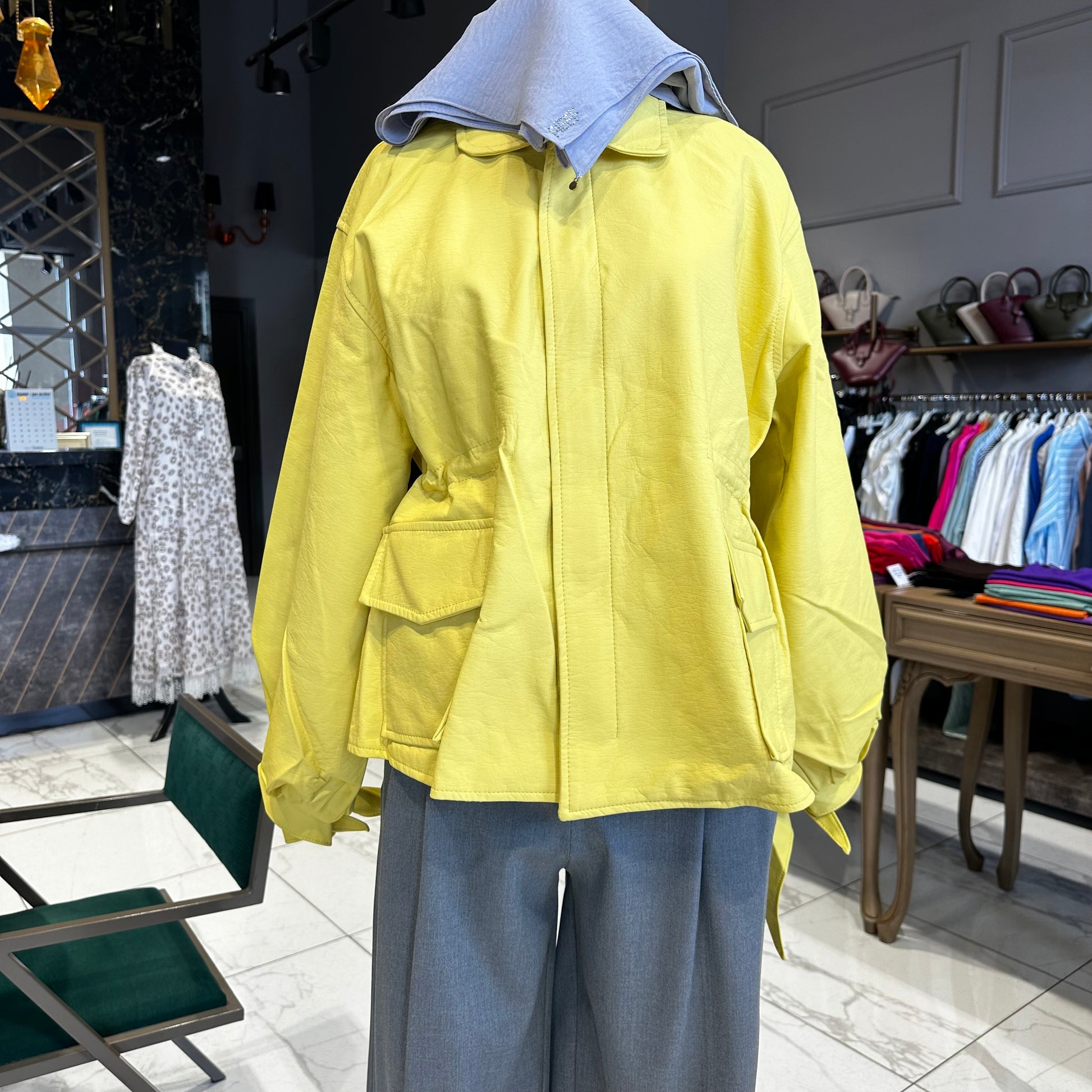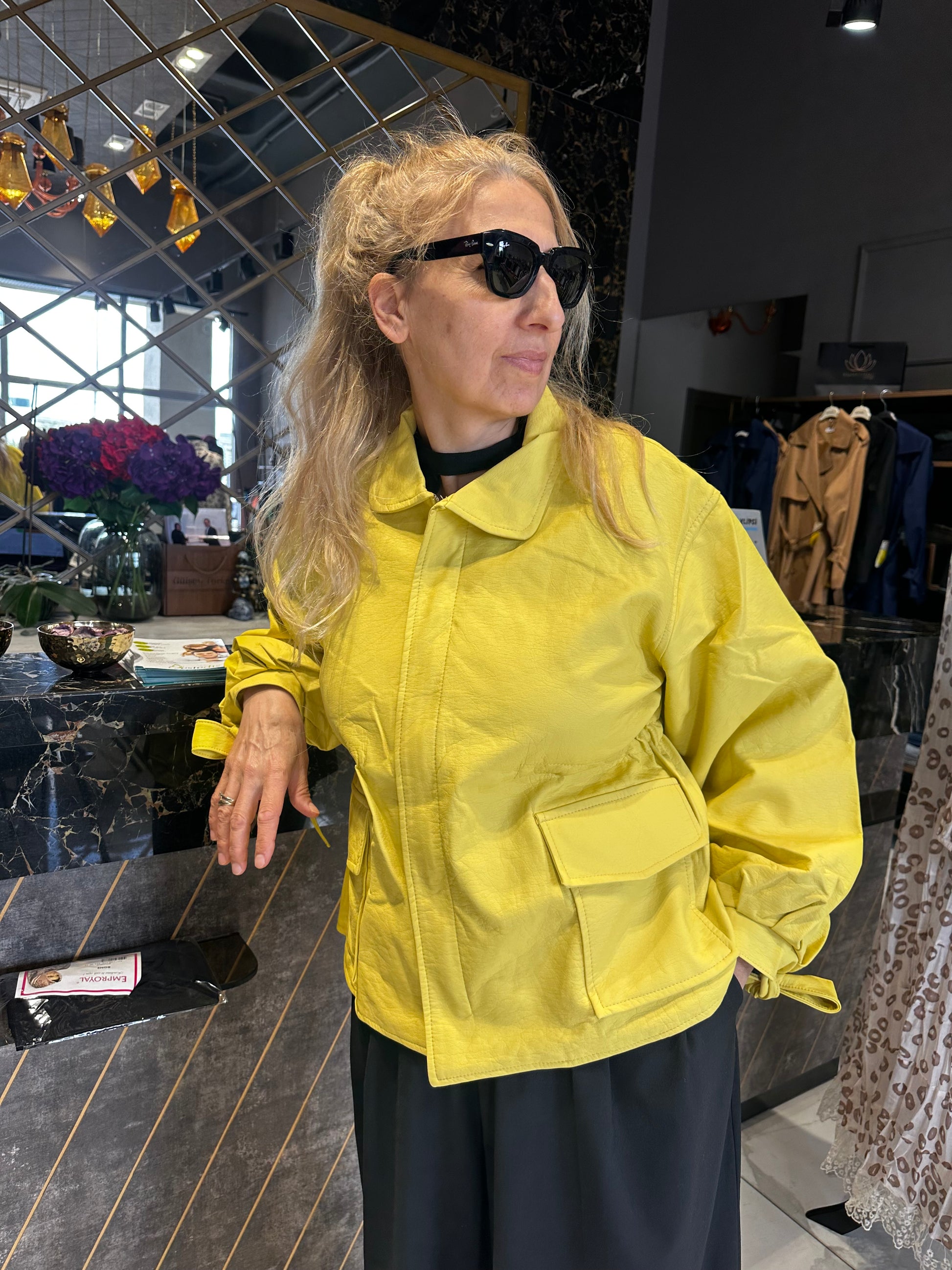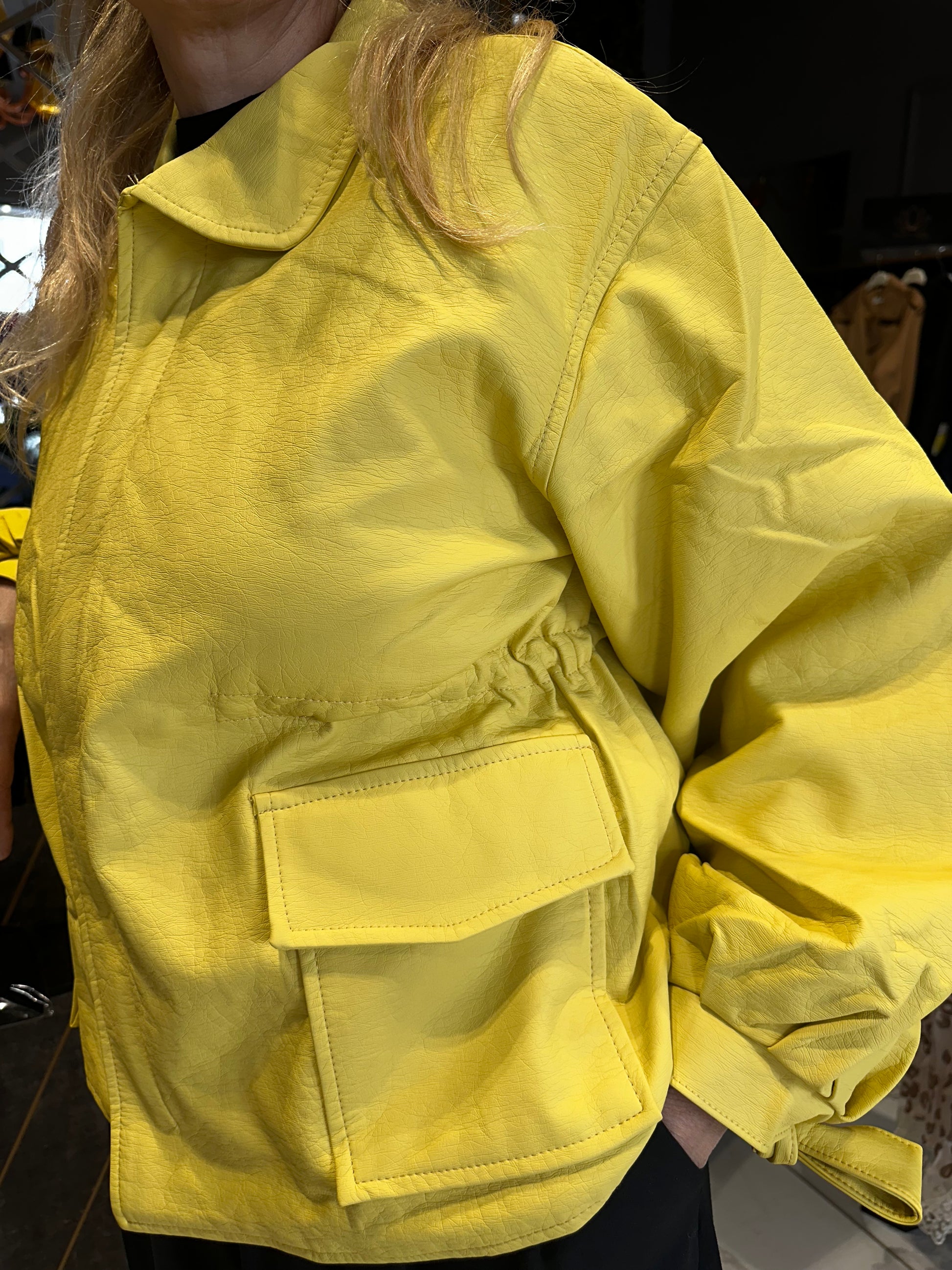 Yumuşacık dokusuyla, kolları bağcık detaylı beli büzgülü deri ceketimiz.